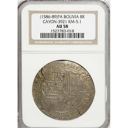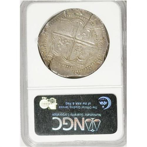 <B>Felipe II cob 8 Reales Assayer A,</B></I> Cayon 3921, AU58 NGC, crudely manufactured with two natural edge cracks, but with no real visible wear. Aged patina and not a salvage coin. Scarce assayer A, 1586-89.<BR><BR><b>Shipping:</b> Coins & Currency (<a target="_blank" href="http://www.heritageauctions.com/common/shipping.php">view shipping information</a>)