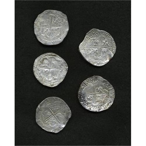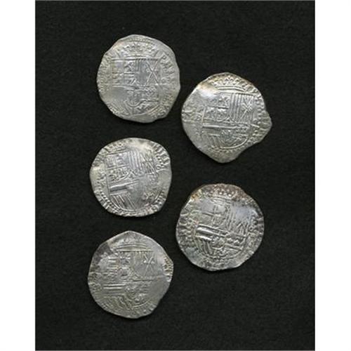 <B>Felipe II cob 8 Reales - Assayer B Quintet,</B></I> five pieces, all later style with smaller flans and less round planchets, all have the P mintmark and B assayer letter below. One B appears to be reengraved from a P. Grades are crude Fine to VF, and all have been cleaned at one time. <B>Sold as is, no return lot.</B></I><BR><BR><b>Shipping:</b> Coins & Currency (<a target="_blank" href="http://www.heritageauctions.com/common/shipping.php">view shipping information</a>)