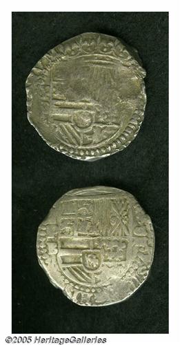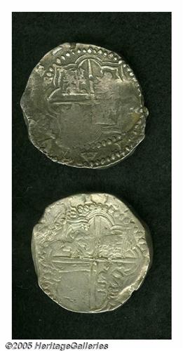 <B>Felipe III (1598-1621) 8 Reales ND Assayer B, </B></I>Cayon unlisted assayer but Type 68, two pieces: Fine with clear mint but weak B, and decent F-VF with strong P, B and denomination and readable III ordinal in the outer legend denoting Felipe III.