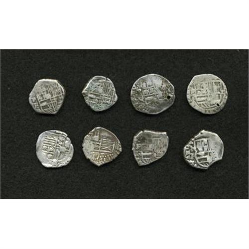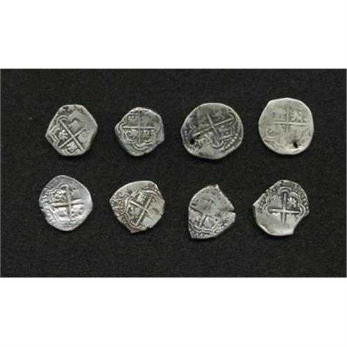<B>Felipe III & IV cob 1 Real Study Group,</B></I> eight coins, all undated but several with P mintmark and/or assayer's initials including E, TR and Q. One example has a partial date, possibly 1634P-TR. Conditions range from Fine to VF and two examples are holed. <B>Sold as is, no return lot.</B></I><BR><BR><b>Shipping:</b> Coins & Currency (<a target="_blank" href="http://www.heritageauctions.com/common/shipping.php">view shipping information</a>)