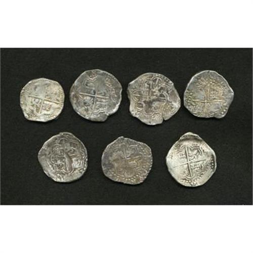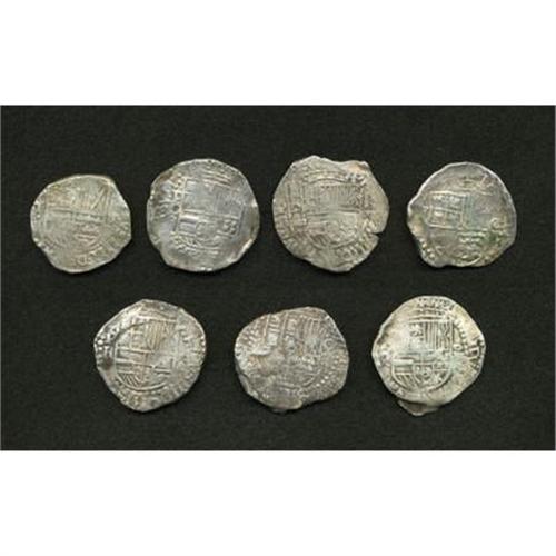 <B>Felipe III & IV cob 8 Reales Mixture,</B></I> seven examples, most with readable P mintmark and/or assayer's initial, one with partial probable date 621 in the reverse legend. Grades are crude Fine to VF, with none holed or sea salvaged. <B>Sold as is, no return lot.</B></I><BR><BR><b>Shipping:</b> Coins & Currency (<a target="_blank" href="http://www.heritageauctions.com/common/shipping.php">view shipping information</a>)