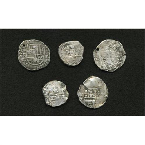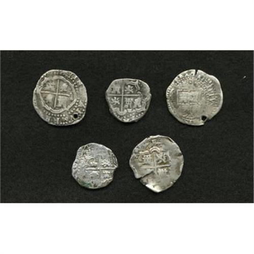 <B>Felipe IV cob 2 Reales - Early Types,</B></I> five examples including: KM14a, four pieces grading F-VF, one holed, at least two with assayer TR and one with partial date 164x; and scarce final transitional type (1652P-E) with P 2 IIII and 2 in the date position, porous Fine and holed. <B>Sold as is, no return lot.</B></I><BR><BR><b>Shipping:</b> Coins & Currency (<a target="_blank" href="http://www.heritageauctions.com/common/shipping.php">view shipping information</a>)