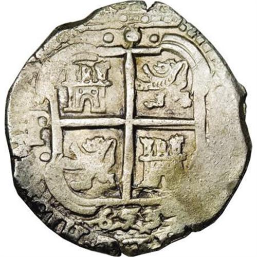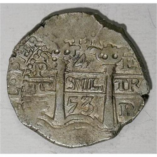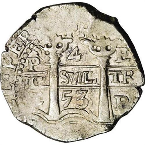 <B>Felipe IV cob 4 Reales 1653P-E,</B></I> KM18, sharp VF+, surfaces lightly porous and cleaned at one time, very scarce early date with PH above the pillars. Virtually perfectly centered with full details including a second date on the reverse and complete cross. Ex-La Capitana Sale, Ponterio 99 lot 273.<BR><BR><b>Shipping:</b> Coins & Currency (<a target="_blank" href="http://www.heritageauctions.com/common/shipping.php">view shipping information</a>)