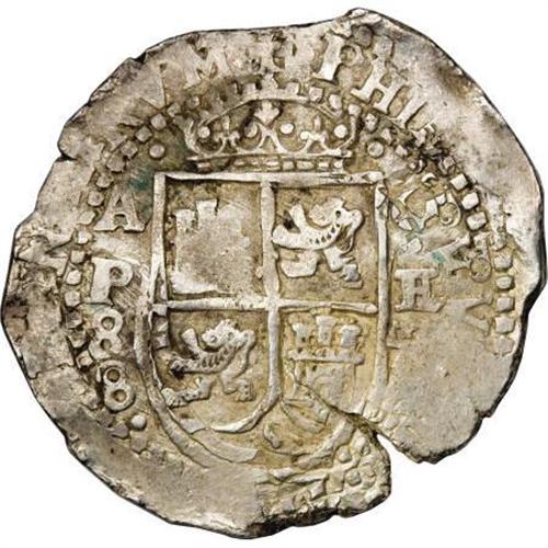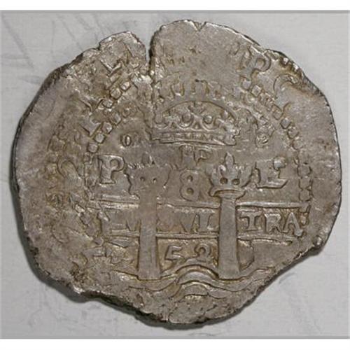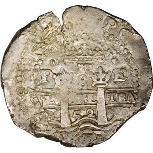 <B>Felipe IV cob 8 Reales 1652P-E Transitional,</B></I> KM-A20, choice XF, type VI or VII with HP, P 8 E and E 52 probably P below, reverse A with P-E flanking the coat of arms. On the obverse the foot of the P appears below a wave making the attribution to type VII virtually secure. Somewhat crudely shaped planchet, but good weight at 27.35 grams. Very scarce and desirable type.<BR><BR><b>Shipping:</b> Coins & Currency (<a target="_blank" href="http://www.heritageauctions.com/common/shipping.php">view shipping information</a>)