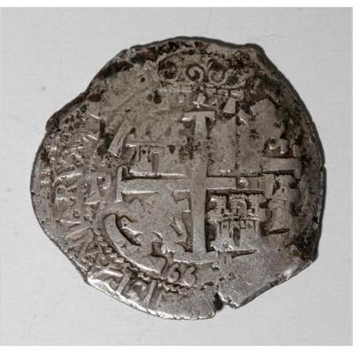<B>Felipe IV cob 8 Reales - Trio of Dates,</B></I> KM21, 1653P-E, very dark Fine, sea salvage example, clear date, mint and assayer and PH above the pillars, 1658P-E, VF, double-struck obverse but with critical details readable, second date and full cross on the reverse, and 1664P-E, crude F-VF, most of two dates, complete reverse cross. <B>Sold as is, no return lot.</B></I><BR><BR><b>Shipping:</b> Coins & Currency (<a target="_blank" href="http://www.heritageauctions.com/common/shipping.php">view shipping information</a>)