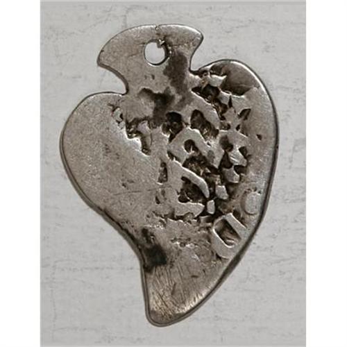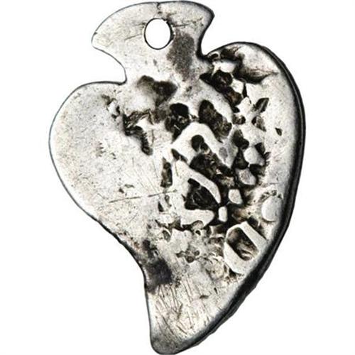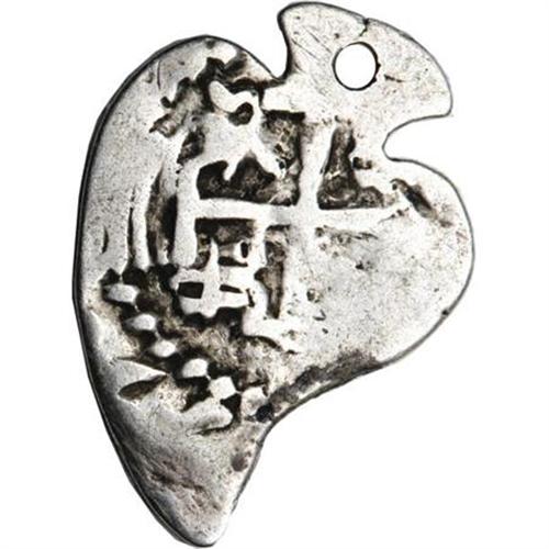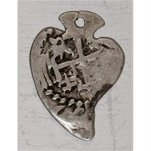 <B>Felipe V Heart-shaped cob 1/2 Real 1727(P),</B></I> type of KM27, crude VF and holed at the top. The obverse features a very clear date, 727, but the monogram is not struck up, making attribution to Felipe V or Luis I difficult at best. The reverse appears to show a portion of the P mintmark to the left of the cross. All heart-shaped cobs of this denomination are rare with perhaps five known examples of all dates. 1.41 grams.<BR><BR><b>Shipping:</b> Coins & Currency (<a target="_blank" href="http://www.heritageauctions.com/common/shipping.php">view shipping information</a>)