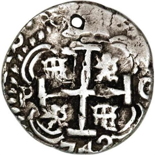 <B>Felipe V Royal cob 2 Reales 1742P-C,</B></I> KM-R29a, choice toned VF+, holed in the waves below the date, clearly readable date, mintmark and assayer's initial on both sides. 5.96 grams. Rare presentation coinage struck on a specially prepared round planchet.<BR><BR><b>Shipping:</b> Coins & Currency (<a target="_blank" href="http://www.heritageauctions.com/common/shipping.php">view shipping information</a>)