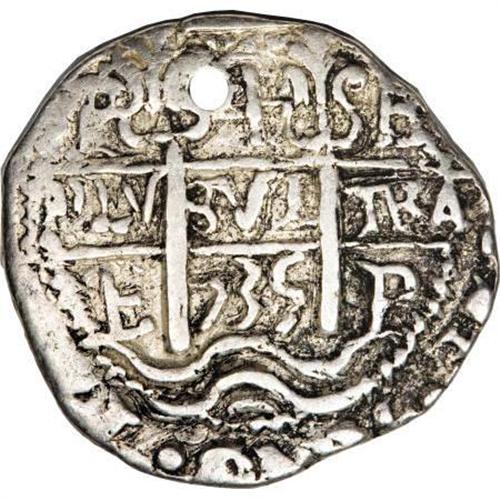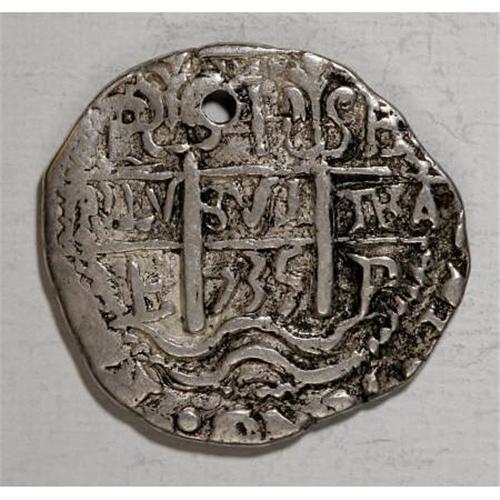 <B>Felipe V Royal cob 4 Reales 1735P-E,</B></I> KM-R30a, VF, holed at the top, clearly readable date, mintmark and assayer's initial on both sides. 12.84 grams. All royal 4 Reales are rare.<BR><BR><b>Shipping:</b> Coins & Currency (<a target="_blank" href="http://www.heritageauctions.com/common/shipping.php">view shipping information</a>)