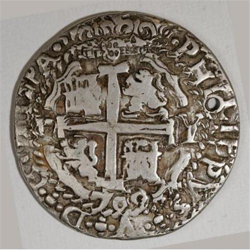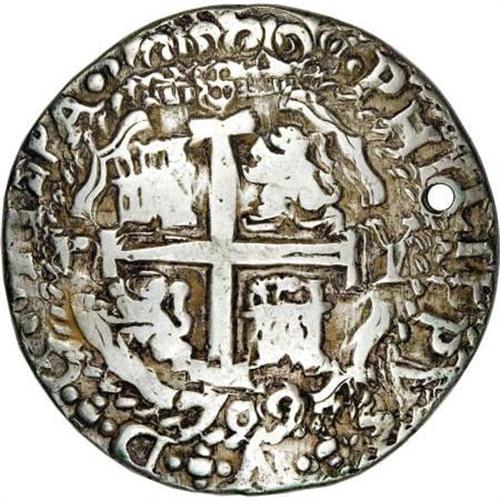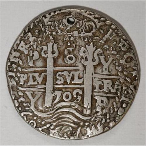 <B>Felipe V Royal cob 8 Reales 1709P-Y,</B></I> KM-R31, Lazaro 250, toned VF, holed at the top, very attractive. All three dates are visible along with the mintmark and assayer details. 26.53 grams. An excellent example of this rare presentation coinage.<BR><BR><b>Shipping:</b> Coins & Currency (<a target="_blank" href="http://www.heritageauctions.com/common/shipping.php">view shipping information</a>)