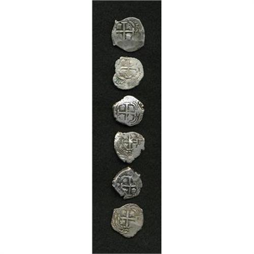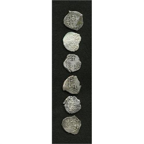 <B>Felipe V cob 2 Reales Date Run,</B></I> KM29, six examples featuring: 1703P-Y, two dates, cleaned VF, 1709Y, assayer on both sides, VF, 1721P-Y, Fine, 1726P-Y, VF, two dates with mint and assayer initials clear on both sides, full cross and often attributed to Luis I, 1737P-E, choice VF, two full dates and mint and assayer initials on both sides, and 1740P-P, crude VF. An exceptional group with several unusually appealing coins. <B>Sold as is, no return lot.</B></I><BR><BR><b>Shipping:</b> Coins & Currency (<a target="_blank" href="http://www.heritageauctions.com/common/shipping.php">view shipping information</a>)