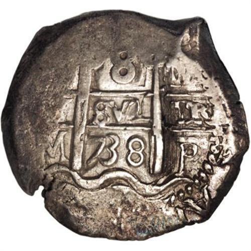 <B>Felipe V cob 8 Reales 1738P-M, </B></I>KM31a, crudely produced but with little actual wear, clear date, mint and assayer on the obverse and date on the reverse. The 8 in the reverse date is obviously reengraved, possible over a 6.<BR><BR><b>Shipping:</b> Coins & Currency (<a target="_blank" href="http://www.heritageauctions.com/common/shipping.php">view shipping information</a>)