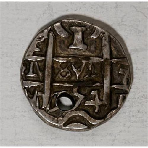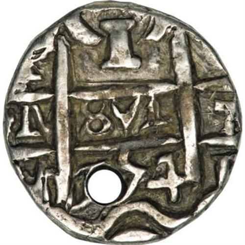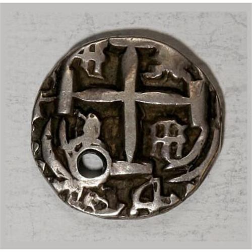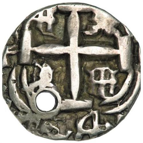 <B>Ferdinand VI Royal cob 1 Real 1754P-(Q),</B></I> KM-R37, toned VF, holed through the 7 of the date, 754. The obverse is nicely centered and portions of both P mintmarks are visible, as are the 54 digits of the date. The assayer is present in part but difficult to determine if the letter is a Q as expected, or a C. The reverse is also well-centered with a second date 54 below the cross and the P mintmark to the left. 3.19 grams. Very rare royal coinage for this reign.<BR><BR><b>Shipping:</b> Coins & Currency (<a target="_blank" href="http://www.heritageauctions.com/common/shipping.php">view shipping information</a>)