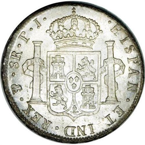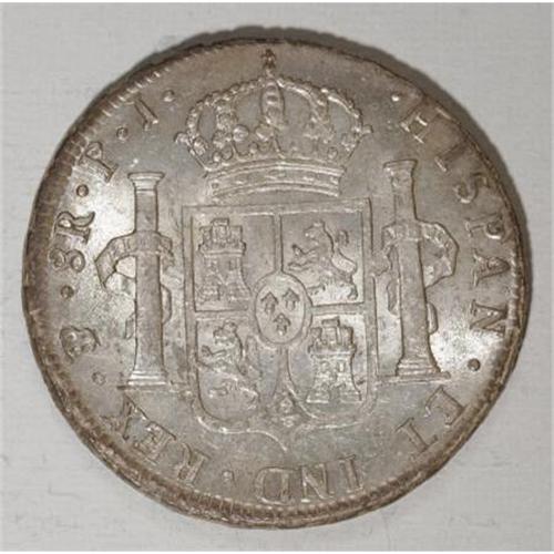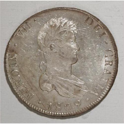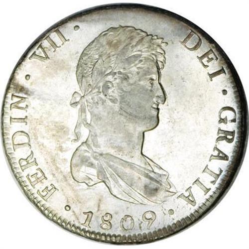 <B>Ferdinand VII 8 Reales 1809-PJ,</B></I> KM84, choice lustrous AU-UNC, well-struck on both sides with flashy original mint brilliance. Very scarce in this premium quality.<BR><BR><b>Shipping:</b> Coins & Currency (<a target="_blank" href="http://www.heritageauctions.com/common/shipping.php">view shipping information</a>)