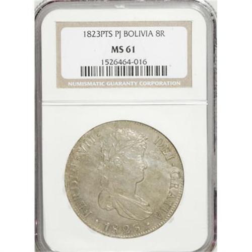 <B>Ferdinand VII 8 Reales 1823PJ,</B></I> KM84, MS61 NGC, lightly toned with considerable mint luster and exceptionally strong design details for this era.<BR><BR><b>Shipping:</b> Coins & Currency (<a target="_blank" href="http://www.heritageauctions.com/common/shipping.php">view shipping information</a>)