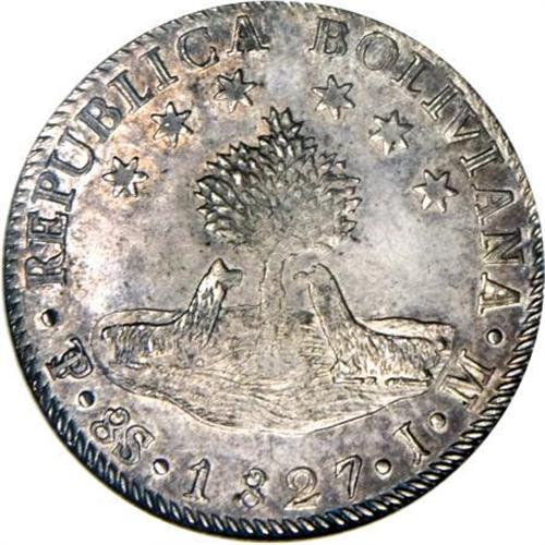 <B>Republic 8 Soles 1827JM,</B></I> KM97, large alpacas, MS62 NGC, a nicely struck coin with attractive old-time patina. A similar coin in our January 2004 sale brought $747.<BR><I>From The Madison Collection.</B></I><BR><BR><b>Shipping:</b> Coins & Currency (<a target="_blank" href="http://www.heritageauctions.com/common/shipping.php">view shipping information</a>)