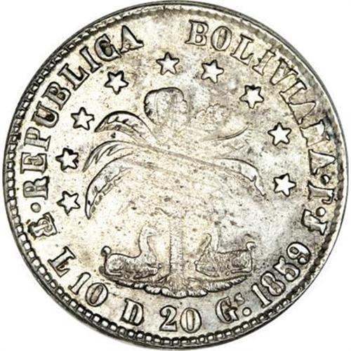 <B>Republic 8 Soles 1859FJ Po 400 Gs,</B></I> KM138.1, lightly toned XF, weakly struck on the center of the reverse, but an attractive example of this very rare one year type with the obverse legend reading Po 400 Gs. This coin is apparently new to the numismatic insiders of Latin numismatics, having recently surfaced in Europe. When we sold a VF specimen in January 2004 (ex-Geiger and Von Schuckmann) we noted that only six pieces had been reported. A most pleasing coin with perfectly balanced patina and underlying luster. <BR><BR><b>Shipping:</b> Coins & Currency (<a target="_blank" href="http://www.heritageauctions.com/common/shipping.php">view shipping information</a>)