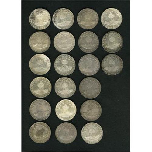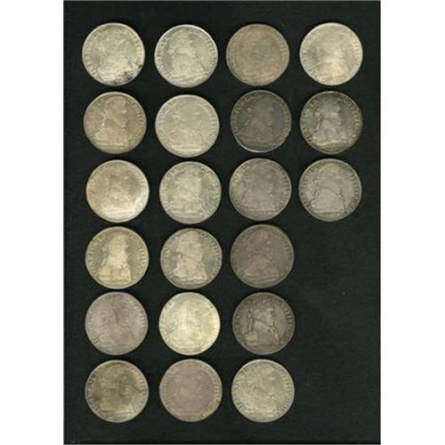 <B>Republic 8 Soles Date Collection,</B></I> KM97, an extensive grouping featuring: 1827JM small alpacas, VF and lustrous XF, noticeable oxidation, 1827JM large alpacas, choice lustrous AU, boldly struck and very attractive, 1828JM cleaned AU, porous surfaces, 1829JM cleaned AU, weakly struck bust, 1830JF, VF-XF, small edge flaw, 1831JL, AVF, 1833L, toned VF+, large scratch to the left of the bust, very scarce assayer, 1833LM, VF-XF, 1834LM, choice lustrous AU, 1835LM, VF minor scratches, 1836LM, toned XF, porous surfaces, 1837LM, lustrous AU, large adjustment marks, 1838LM, VF+, porous XF and XF, 1839LM, toned XF and lustrous AU, 1839LR, XF, and 1840LR, cleaned AU with patination remaining and choice toned AU. <B>Sold as is, no return lot.</B></I><BR><BR><b>Shipping:</b> Coins & Currency (<a target="_blank" href="http://www.heritageauctions.com/common/shipping.php">view shipping information</a>)