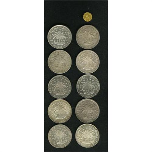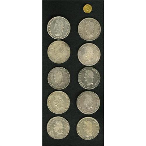 <B>Republic 8 Soles Date Collection & More,</B></I> KM138.6, value as 400 Gs, 1860FJ, toned XF and choice lustrous AU, 1861FJ, VF+, cleaned XF, adjustment marks, and XF, 1862FJ, XF tiny flan flaws and toned AU, 1862FP, nice AU, very bold details, 1863/2FP, XF and 1863FP, lightly cleaned XF. Also added: KM113 gold 1/2 Scudo 1855FP, bold AU, but cleaned and expertly repaired through the C of Constitution. <B>Sold as is, no return lot.</B></I><BR><BR><b>Shipping:</b> Coins & Currency (<a target="_blank" href="http://www.heritageauctions.com/common/shipping.php">view shipping information</a>)