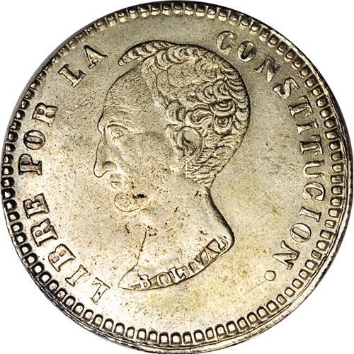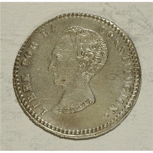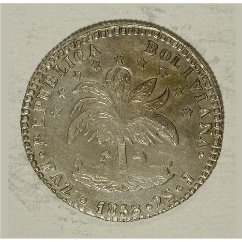 <B>Republic Barehead 2 Soles 1853-J La Paz, </B></I>KM122, choice AU, crudely produced but an exceptionally handsome example of this extremely rare type with perfectly centered details and bold design features. The Krause-Mishler plate coin and easily one of the finest known.<BR><BR><b>Shipping:</b> Coins & Currency (<a target="_blank" href="http://www.heritageauctions.com/common/shipping.php">view shipping information</a>)
