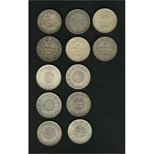 <B>Republic Boliviano Date Selection,</B></I> KM155.2 1870ER, 11 stars, wide wreath and 25 Gms, fully lustrous AU-UNC, KM155.3 1870ER, 11 stars, normal wreath, VF-XF and 1871FP, toned XF, numerous surface marks, KM155.4, nine stars, 1871ER, VF-XF and AU, 1872FE, XF and lovely toned AU-UNC, 1872FE, L/B in Republica, lustrous AU-UNC, KM160.1, ES LA FUERZA, 1872FE, toned VF and XF, 1873FE, choice toned UNC, spectacular multi-hued patina, and 1874FE, toned VF-XF. <B>Sold as is, no return lot.</B></I> <BR><BR><b>Shipping:</b> Coins & Currency (<a target="_blank" href="http://www.heritageauctions.com/common/shipping.php">view shipping information</a>)