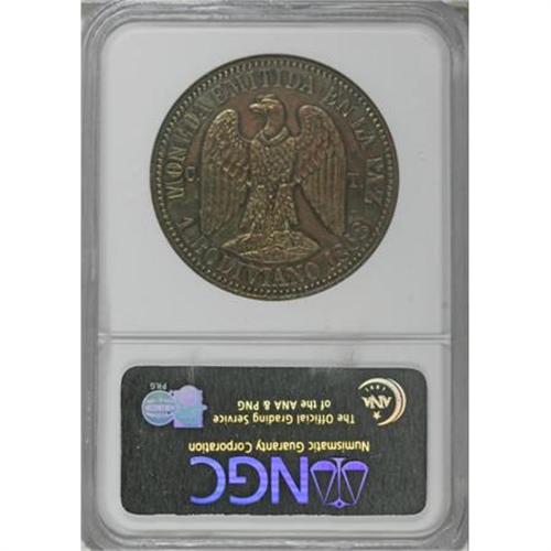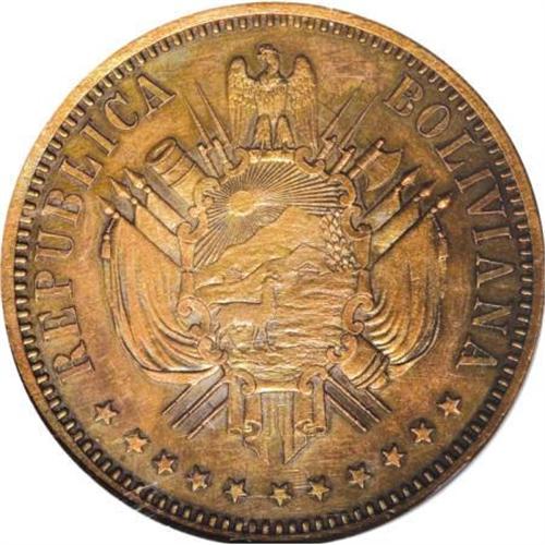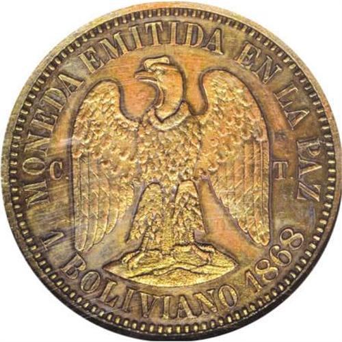 <B>Republic Copper Pattern Boliviano 1868-CT,</B></I> KM-Pn24, reeded edge, Proof 62 Brown NGC Whittier Collection, possibly lightly cleaned long ago, now attractively toned.<BR><BR><b>Shipping:</b> Coins & Currency (<a target="_blank" href="http://www.heritageauctions.com/common/shipping.php">view shipping information</a>)