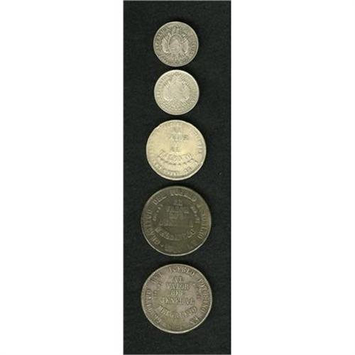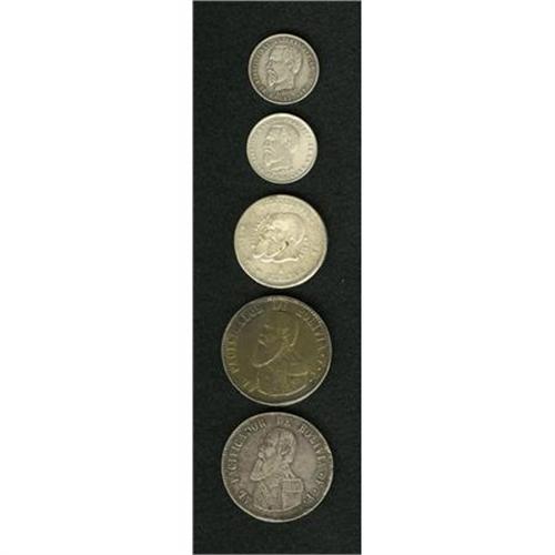 <B>Republic Commemorative Silver Types,</B></I> KM145 1/2 Melgarejo 1865, cleaned VF+, small flaw on the beard, KM146 Melgarejo 1865, two examples, toned VF and nice VF+, both well above average, and KM166 20 Centavos 1879, cleaned with small flaws and toned VF, both with inverted V's in Daza. <B>Sold as is, no return lot.</B></I><BR><BR><b>Shipping:</b> Coins & Currency (<a target="_blank" href="http://www.heritageauctions.com/common/shipping.php">view shipping information</a>)