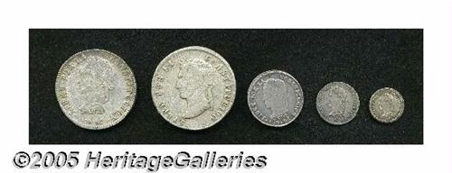 <B>Republic Silver Bolivar Bust Types, </B></I>KM133.1 1/2 Sol 1859-FJ, PESO 25 Gs, choice toned VF, very scarce type, KM134.2 Sol 1860-FJ, toned VF, KM135.2 2 Soles 1860-FJ, rare variety with large 60 over small 60 (and probable 6/5), Fine, light scratch
