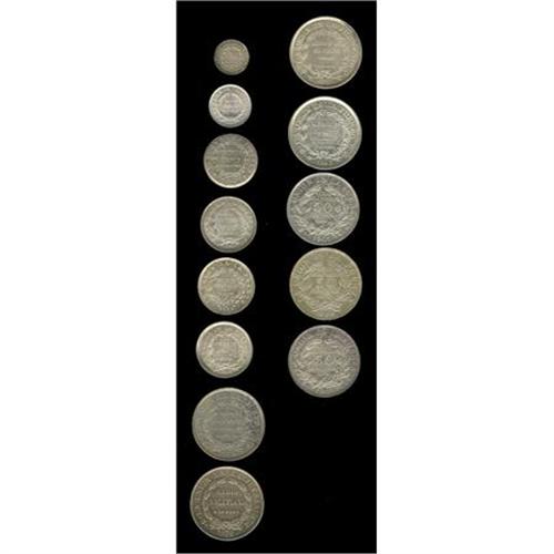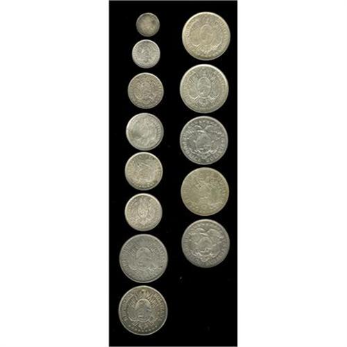 <B>Republic Silver Decimals Assortment,</B></I> KM157.2 5 Centavos 1885FE, toned AU, KM158.2 10 Centavos 1883FE, UNC, KM159.1 20 Centavos 1876FE, XF, KM159.2 20 Centavos 1890FE, AU and 1893CB, AU, KM176 20 Centavos 1909H, UNC, KM161.1 50 Centavos 1873FE 12 Gs, toned XF, scarce, KM161.3 50 Centavos 1879FE, VF-XF but repaired on both sides (by the date and above the condor), rare date & type, KM161.5 50 Centavos 1891CB, XF, and 1893CB, UNC, KM175.1 50 Centavos 1901MM, AU and AU-UNC, and KM177 50 Centavos 1909H, XF-AU. <B>Sold as is, no return lot.</B></I><BR><BR><b>Shipping:</b> Coins & Currency (<a target="_blank" href="http://www.heritageauctions.com/common/shipping.php">view shipping information</a>)