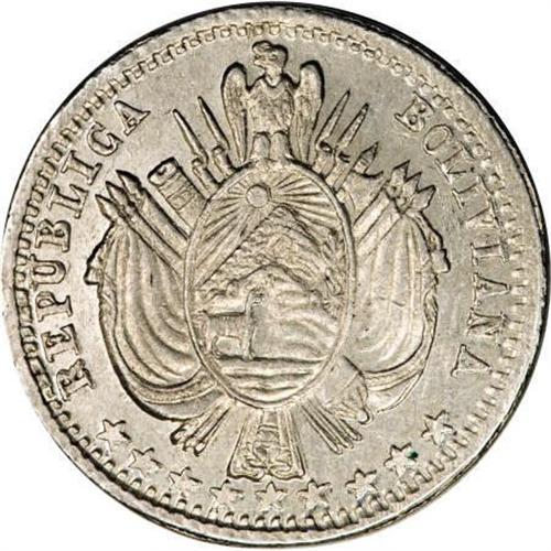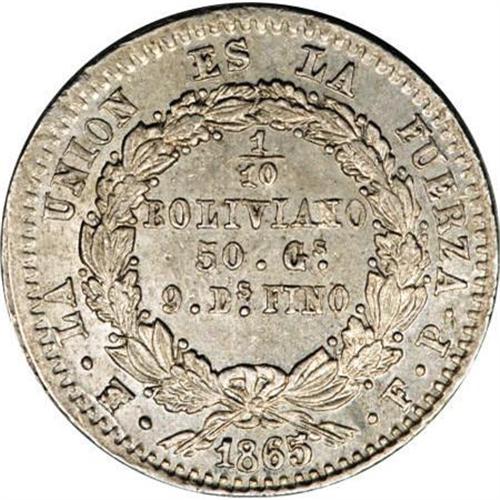 <B>Republic Silver Piefort Pattern 1/10 Boliviano 1865/4-FP,</B></I> KM-PC3, choice UNC, fully lustrous, plain edge, medal alignment and 3.6 grams instead of the 2.5 gram standard used for the business strikes. Very rare artifact from the transitional period to the decimal system in Bolivia. Current catalog value in the SCWC is $2500.<BR><BR><b>Shipping:</b> Coins & Currency (<a target="_blank" href="http://www.heritageauctions.com/common/shipping.php">view shipping information</a>)