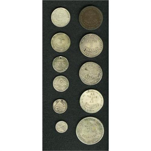 <B>Republic Silver Proclamations and Melgarejo Coinage,</B></I> Melgarjo types: KM144 1/4 Melgarejo 1865 (2), AVF and VF; KM145 1/2 Melgarejo 1865 (3), all AVF; KM146 Melgarejo 1865, nice VF, plus a 1/2 Melgarejo 1865 struck in copper, nice glossy brown XF; and Proclamation coinage, 4 pieces, two holed. <B>Sold as is, no return lot.</B></I><BR><BR><b>Shipping:</b> Coins & Currency (<a target="_blank" href="http://www.heritageauctions.com/common/shipping.php">view shipping information</a>)