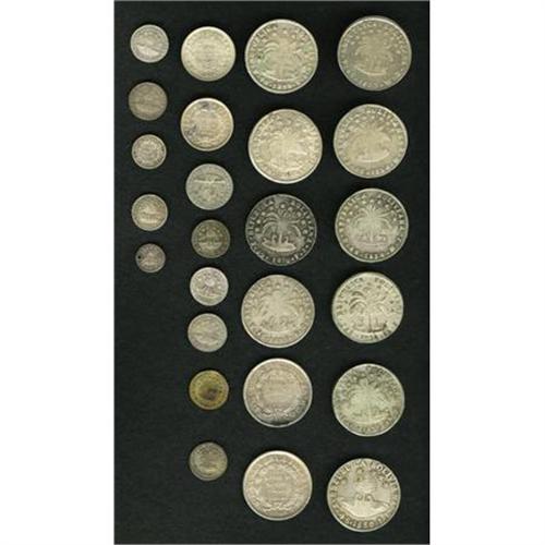 <B>Republic Silver Type & Date Selection,</B></I> twenty-five coins featuring ten 4 Soles, 1830JL, 1854 (2), 1855, 1856, 1857, 1858 and 1859, 1854 Paz and 1856 Paz; plus ten smaller denominations dated 1829-1863 and five decimal types from 1883 to 1909. Grades range from VG to AU with one 1/4 Sol 1852 holed. <B>Sold as is, no return lot.</B></I><BR><BR><b>Shipping:</b> Coins & Currency (<a target="_blank" href="http://www.heritageauctions.com/common/shipping.php">view shipping information</a>)