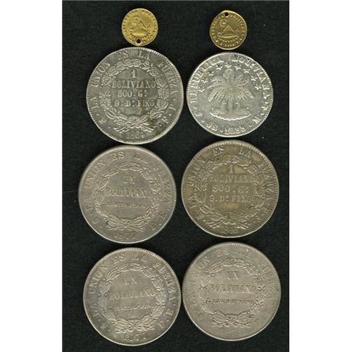 <B>Republic Silver and Gold Assortment, </B></I>KM123.2 4 Soles 1855-MJ error spelling CONSTITUCIN, cleaned XF, softly struck centers but a nice example of this die-cutter's mistake, KM152.1 Boliviano 1864-FP, toned VF, second A/O in BOLIVIANA, KM152.1 Boliviano 1866-FP with assayer's initial inverted, toned VF-XF and rare, KM160.1 Boliviano 1877-FE, toned VF, scarce date, KM160.1 Boliviano 1877/5-FE, clear overdate, nice toned AXF, KM160.2 Boliviano 1879-FE, toned XF, scarce one-year subtype, KM113 gold 1/2 Scudo, two dates, 1855FP, holed VF and 1856-FJ, holed VF with scratches. Catalog value in excess of $2000. <B>Sold as is, no return lot.</B></I><BR><BR><b>Shipping:</b> Coins & Currency (<a target="_blank" href="http://www.heritageauctions.com/common/shipping.php">view shipping information</a>)