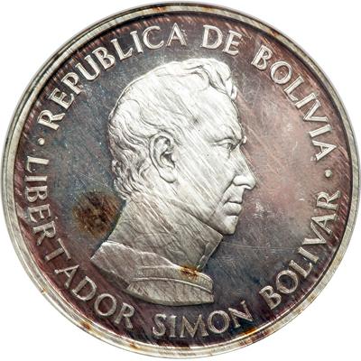 Bolivia. Silver Model, ND (1991). X-TS1. 38.4 mm. Simon Bolivar bust right. Reverse: MODEL in plain field. NGC graded Proof 65.
