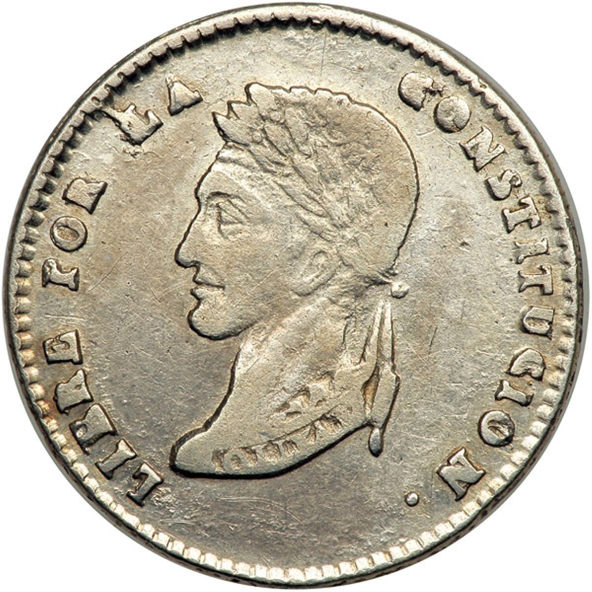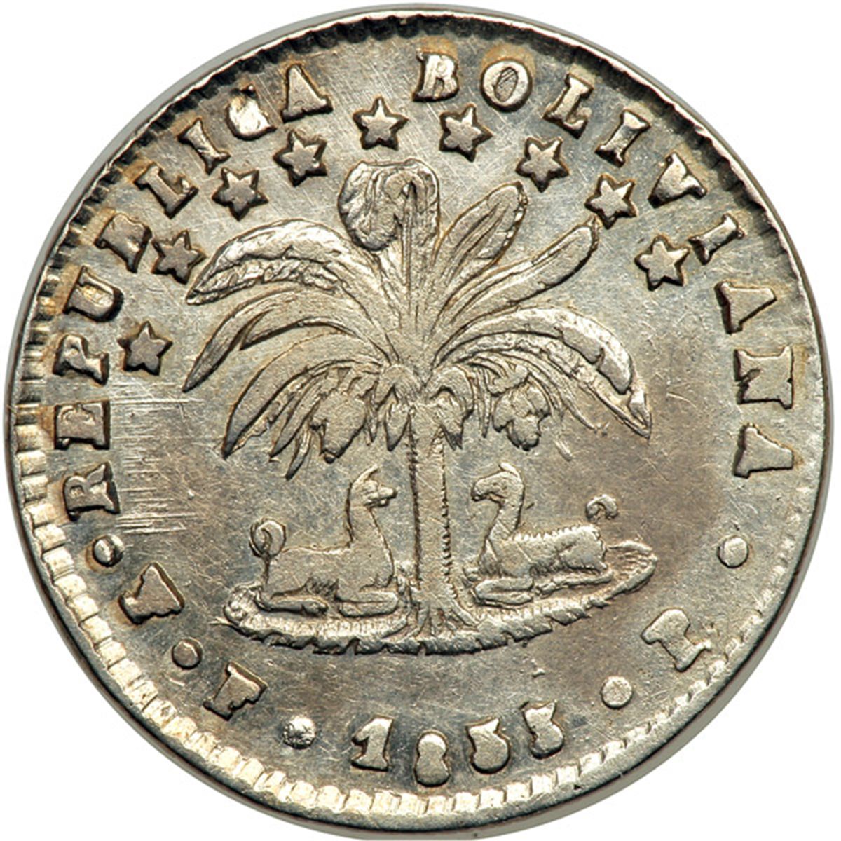 Bolivia. Sol, 1853-FP. KM-119.1. Arms. Without value. Reverse: Bolivar. Lustrous. Extremely Fine to About Uncirculated.