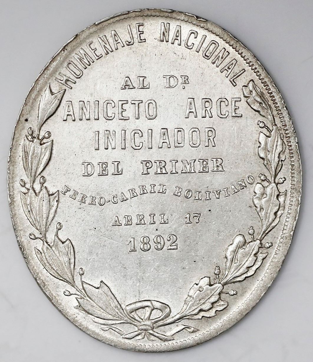 Bolivia, oval silver medal, 1892, completion of Bolivian railway.