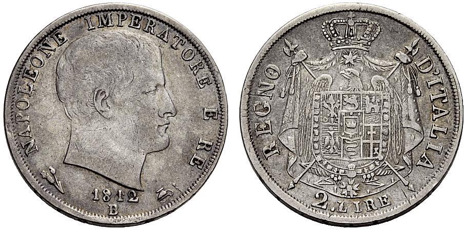 Bologna. Napoleone I, imperatore dei francesi e re d’Italia, 1805-1814. Da 2 lire 1812. Pagani 54a. Raro. Leggera patina, BB