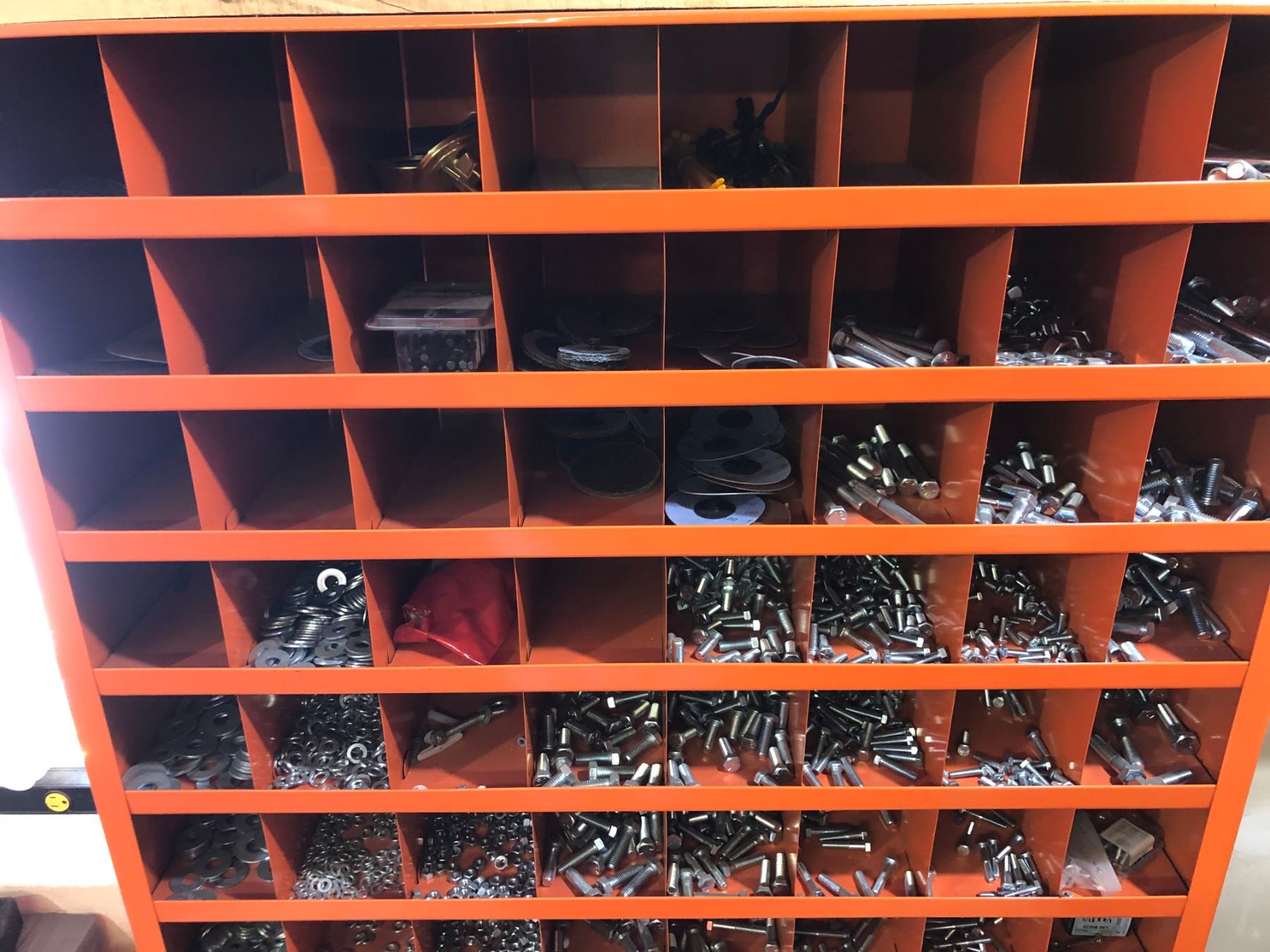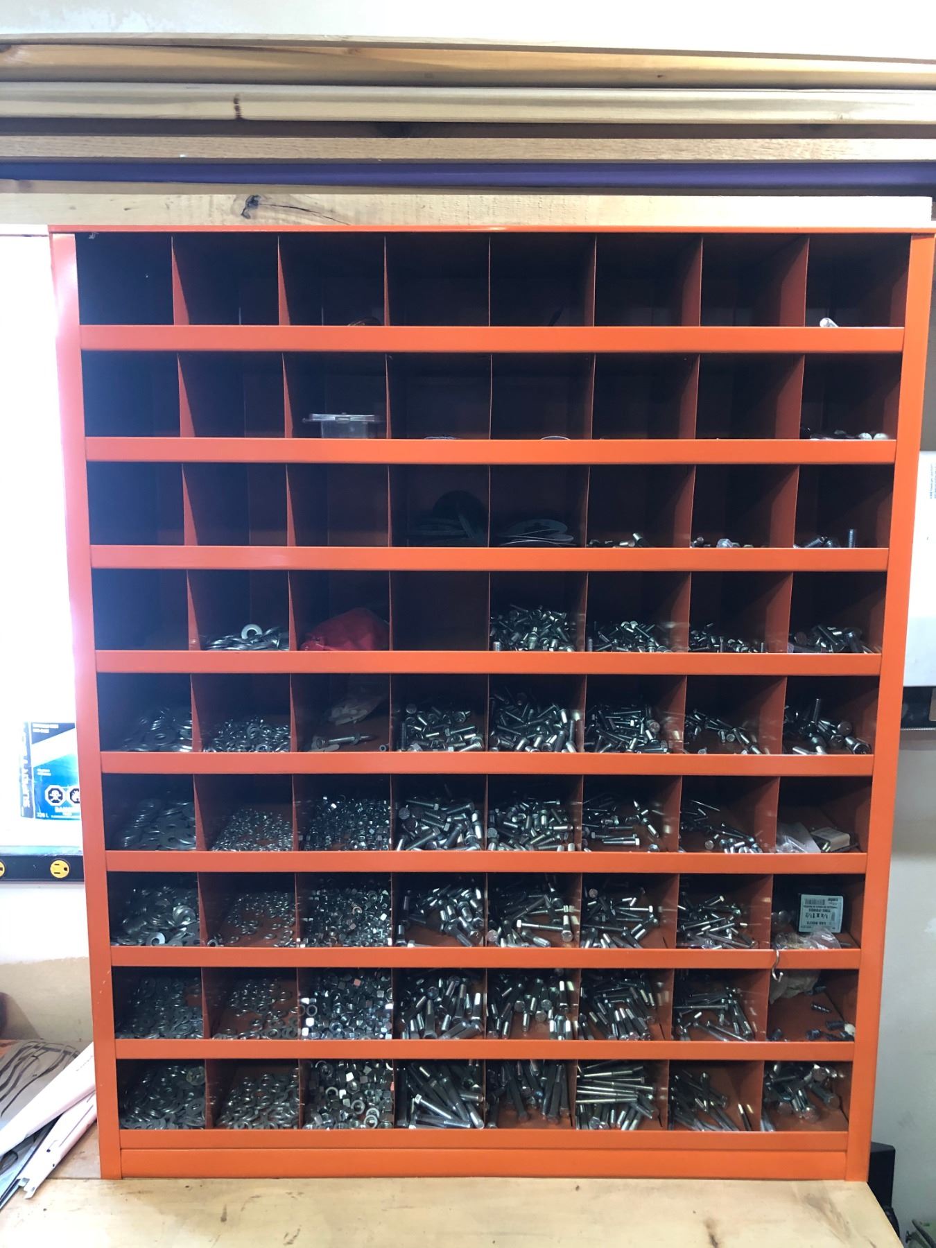 Bolt bin with hardware. Dimensions 41 3/4" high x 35 1/2" wide x 1' deep