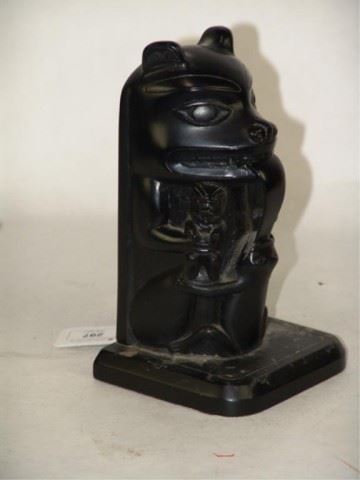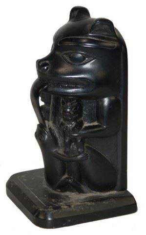 Beautiful faux argillite seated bear totem pole by Boma of Canada. Very good condition, nice and heavy. 7-1/2" x 4-1/2" x 4-1/2" Circa: Ca. 1960, -222037-