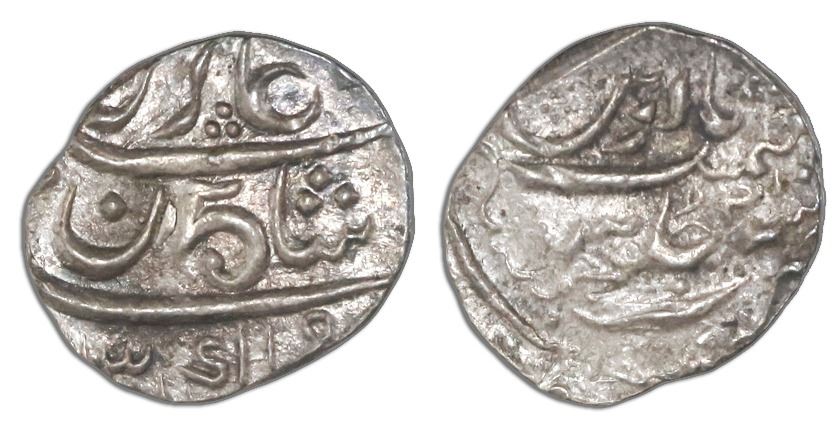 Bombay, India, 1/5 rupee, AH1131//1 (1717-18), NGC AU 53. KM-270. Very bold obverse, crude reverse, nicely toned with hint of luster, second finest in NGC census behind a single MS AU 58. NGC #4725070-009.