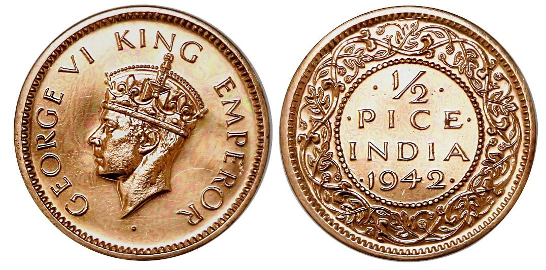 Bombay, India, restrike proof copper 1/2 pice, George VI, 1942(B), NGC PF 62 RD. KM-529. Brilliant proof surfaces with original color and luster ("red"), very faint polish lines, impressively flashy for a copper coin. NGC #4725070-001.