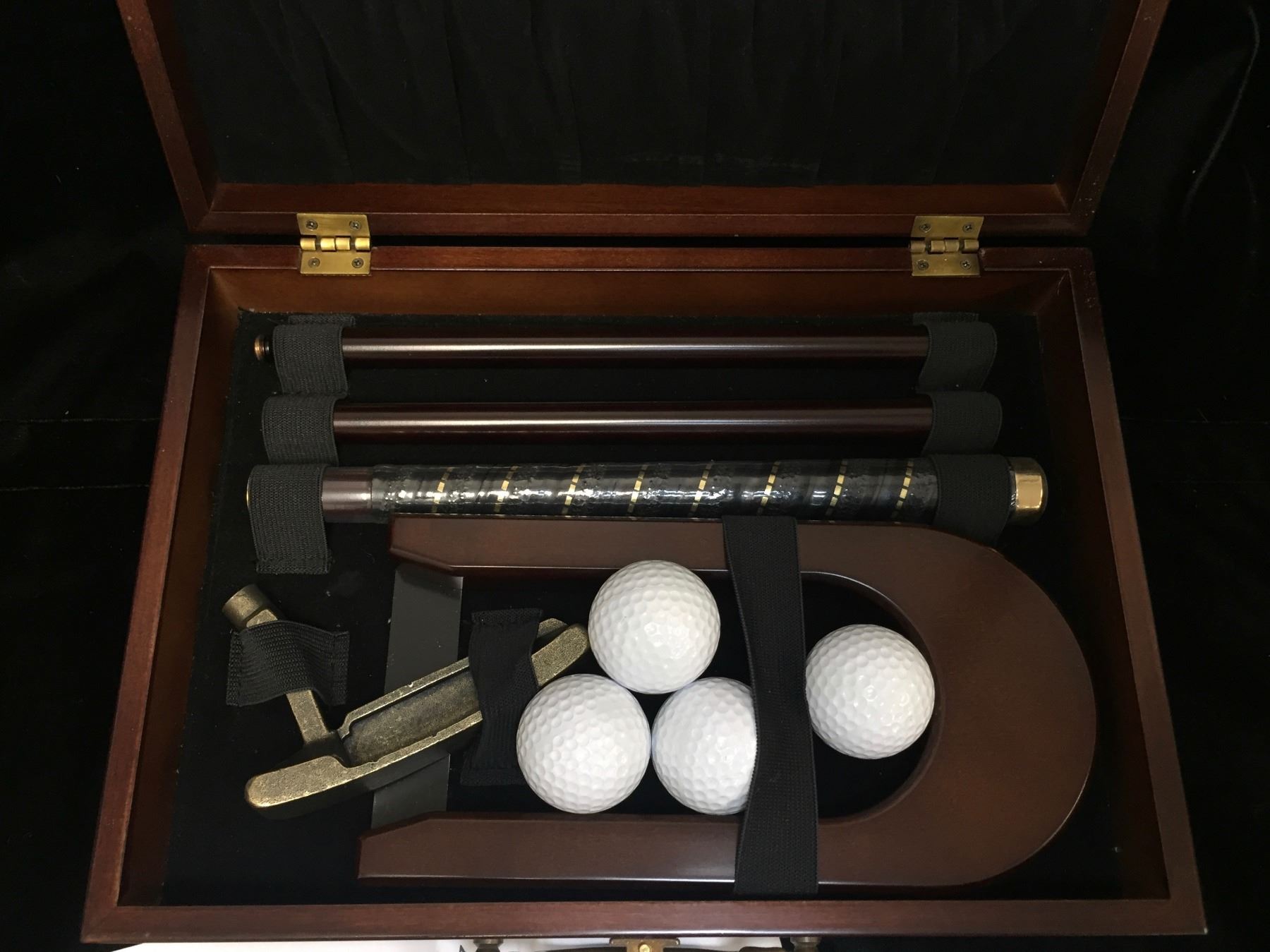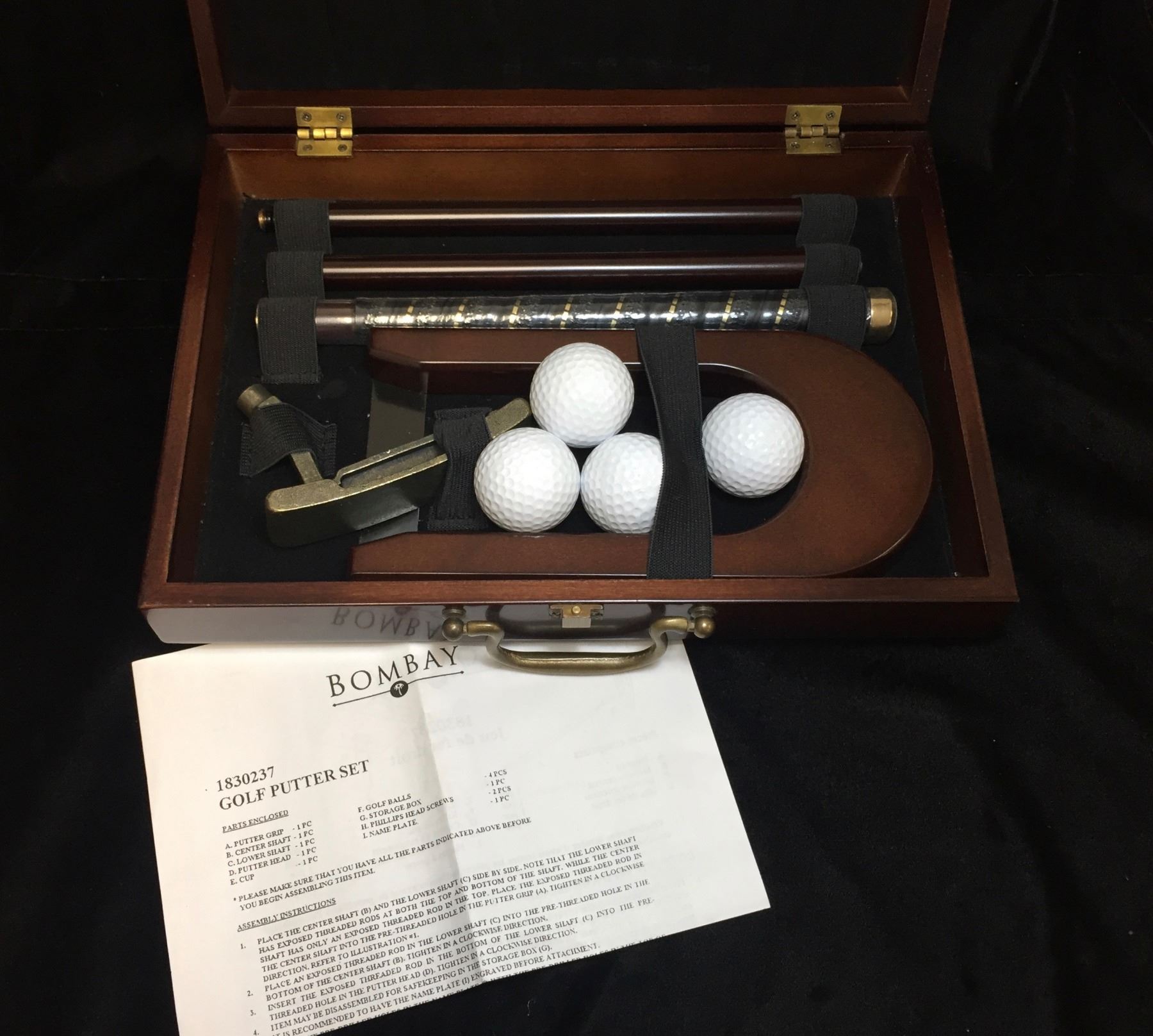 Lot 153; Bombay Office Golf Putter Set, (4) Gold Balls, Name Engraving Plate Included, Storage Case with Latch Closing Mechanism