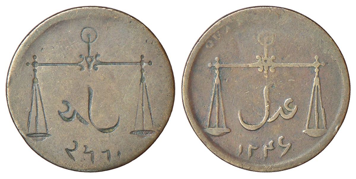 Bombay Presidency, Bombay mint, copper ¼ anna, scales with Persian Adil and AH date 1246 on reverse, reverse part brockage (Lakhi) on obverse, 5.96g.