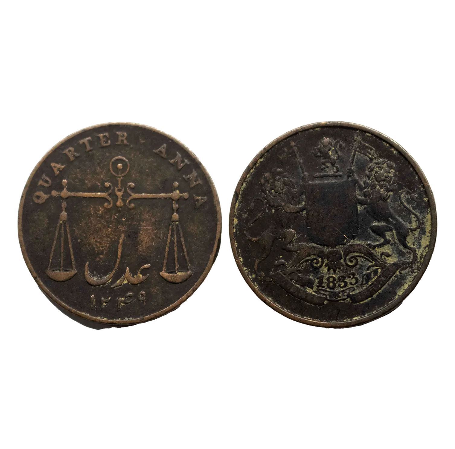 Bombay Presidency, Copper ¼ Anna 1833, 6.20g, obv. coat of arms of the EIC and date below, rev. scales with date AH 1249, medal die (inverted) axis, Error, Da in Adal missing on rev. (Prid 218, KM 232). Fine, Rare.