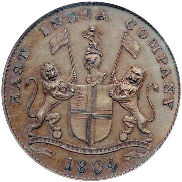 Bombay Presidency. Proof 2 Pice, 1804. Prid-195; KM-206. East India Company. Supported arms. Reverse: Scales. NGC graded Proof 65 Brown.