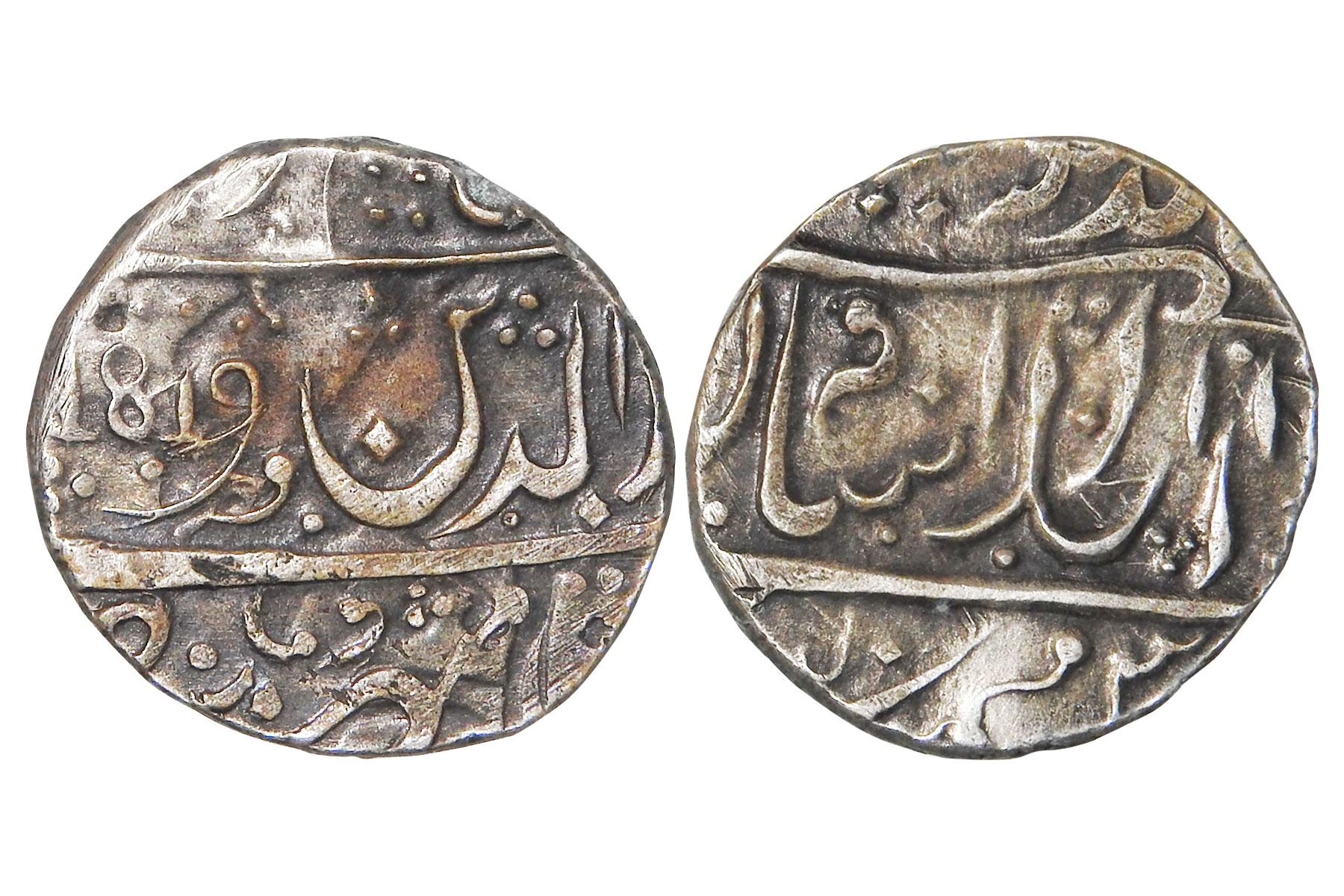 Bombay Presidency - transitional coinage, Bagalkot mint, Silver Rupee, in the name of Shah Alam II, dated AD 1819 in English numerals on obverse, Stevens EIC 6.44, 11.00 grams. Fine, Rare.