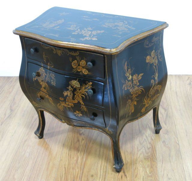 Black & gold lacquer, 3-drawer. Bombe front & sides. Approx. 25 1/2" H x 26" W x 15 1/2" D.