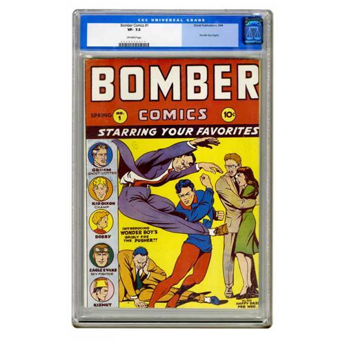 <B>Bomber Comics #1 (Elliot, 1944) CGC VF- 7.5 Off-white pages.</B></I> The cover colors here really pop -- we were amazed not to find a pedigree notation on the label! And the whites on the back cover are very impressive as well. And look who's pictured on the front cover, it's Wonder Boy from Quality's <B>National Comics</B></I>, who somehow made the jump to this Elliot publication. The supporting cast includes Grimm, Ghost Spotter and the fez-wearing Kismet, Man of Fate. Overstreet 2005 VF 8.0 value = $481. CGC census 12/05: 2 in 7.5, 3 higher.