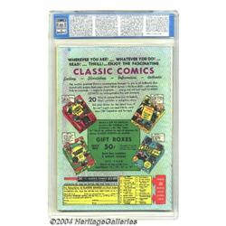 <B>Bomber Comics #4 (Elliot, 1944) CGC FN/VF 7.0 Off-white to white pages.</B></I> This issue of <B>Bomber Comics</B></I> is coveted for its Hitler/Tojo/Mussolini cover. It is interesting to note that this cover is a swipe of the cover to <B>Sensation</B></I> #13. Another point of interest is the full page ad for <B>Classic Comics</B></I> boxed sets on the back cover. Offbeat? Weird? Cool? You bet! To date, no other copies of this issue have been graded higher by CGC. Overstreet 2004 FN 6.0 value = $183; VF 8.0 value = $381. <BR><BR><B>Important notice:</B> Heritage usually auctions material at the rate of 200-250 lots per hour. On some occasions eBay Live bid software or the Internet may not be able to keep up with the pace of the auction. We recommend placing a realistic absentee bid now as insurance to avoid disappointment. Occasionally the auctioneer may eliminate or reject an eBay Live bid, and the auctioneer may also reopen a lot after the close of the eBay live bidding (usually because we missed an audience bid), and may reject your bid even if it shows you as the winning bidder. By bidding via eBay Live, you agree that Heritage may award the lot to another bidder at its sole discretion under the circumstances described above or any other reasonable circumstances. Since eBay bids are not shown to us until we open the lot on the floor, we treat those bids just like floor bids. In most cases the floor responds before the eBay bid is presented to us, due to Internet lag time, so for consistency we have made it a policy that floor bids are always considered first over tie eBay live bids. Also please note that all Heritage lots purchased through eBay Live carry a 20% Buyer's Premium. Please make sure you read the Terms and Conditions before you bid.