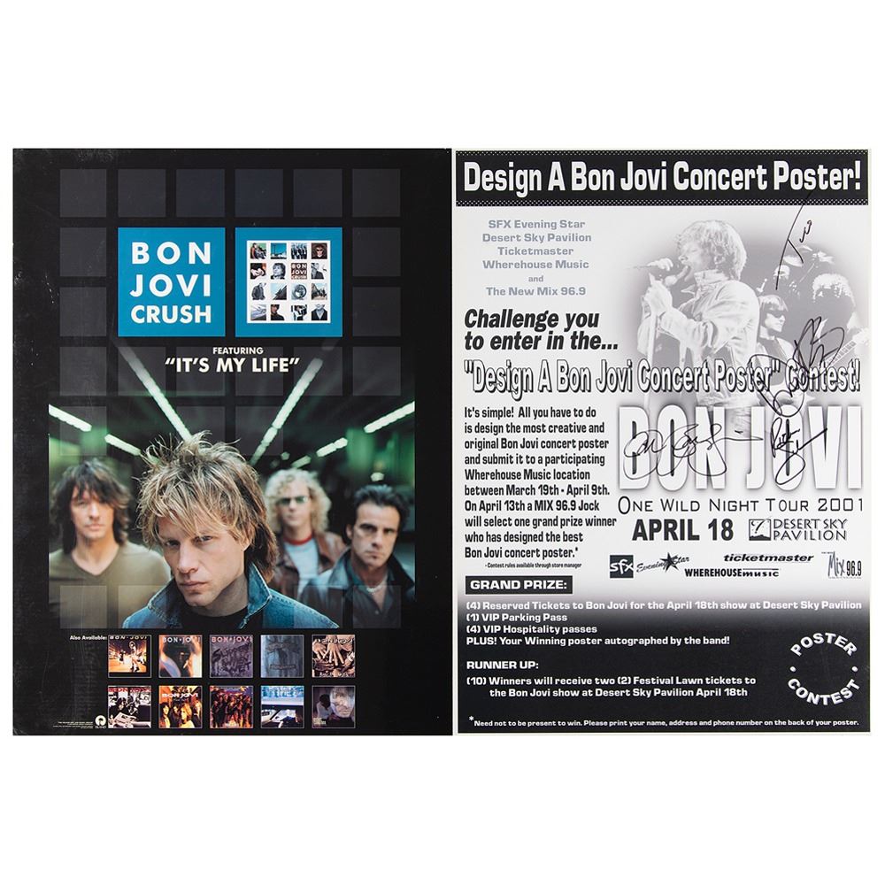 Laminated 17 x 23.75 promotional poster for a “Design a Bon Jovi Concert Poster” contest held during the band’s One Wild Night Tour, signed in black felt tip by Jon Bon Jovi, Richie Sambora, Tico Torres, and David Bryan. The poster notes that the grand prize winner will receive four tickets for Bon Jovi’s concert at the Desert Sky Pavilion in Phoenix, Arizona, on April 18, 2001, VIP parking and hospitality passes, and band signatures on the winning poster. Presented next to a color poster for Bon Jovi’s Crush album, both of which are affixed to a 35 x 23.75 foamcore mount. In fine condition.