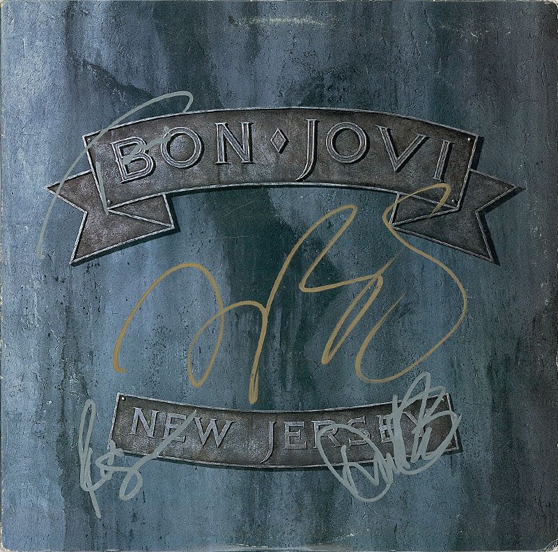New Jersey album signed on the front cover in gold ink by Jon Bon Jovi and in silver ink by Tico Torres, Richie Sambora, and David Bryan. In fine condition, with some light edge wear and a mild ‘ring of wear’ to cover. The record is included.